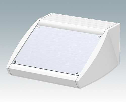 Ergonomic IP 54 rated sloping front enclosure for desktop or wall mounted electronics equipment. Pre-assembled aluminium case body with removable base panel. Front aperture for mounting the accessory front panels. Recessed rear face for mounting switches and power and data connections. To maintain IP 54 rating, fit PCB pillars M5600001, or your own plugs to the mounting holes in the base panel.