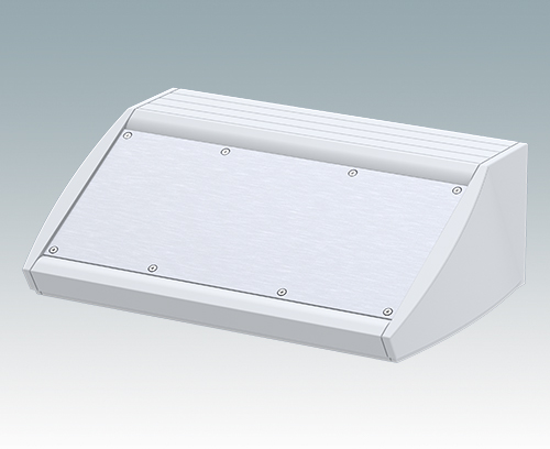 Ergonomic sloping front enclosure for desktop or wall mounted electronics equipment. Pre-assembled aluminium case body with removable base panel. Front aperture for mounting the accessory front panels.  Recessed rear face for mounting switches and power and data connections.