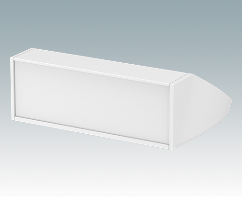 Ergonomic sloping front enclosure for desktop or wall mounted electronics equipment. Pre-assembled aluminium case body with removable base panel. Front aperture for mounting the accessory front panels.  Recessed rear face for mounting switches and power and data connections.