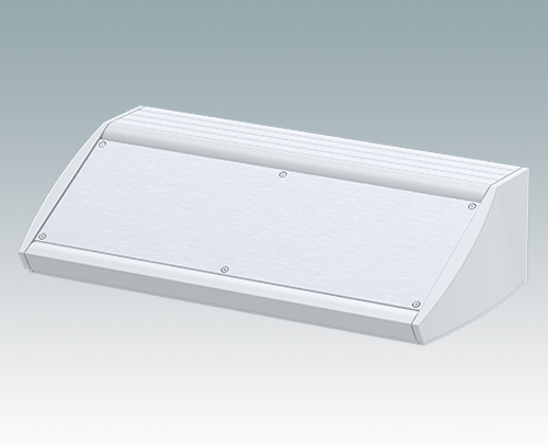 Ergonomic sloping front enclosure for desktop or wall mounted electronics equipment. Pe-assembled aluminium case body with removable base panel. Front aperture for mounting the accessory front panels.  Recessed rear face for mounting switches and power and data connections.